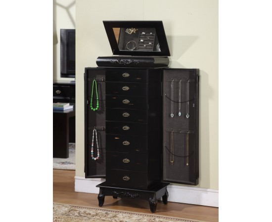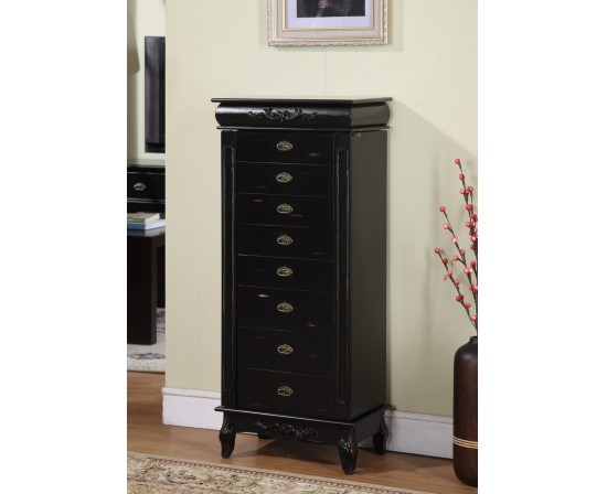 Handcrafted with a distressed black finish, this antique looking jewelry armoire features two elegant flower carvings on its face, cabriolet legs, carvings on the swing-out doors, Queen Ann inspired plated drawer pulls, and a lift top mirror that reveals a lined and divided compartments for different types of jewelry.