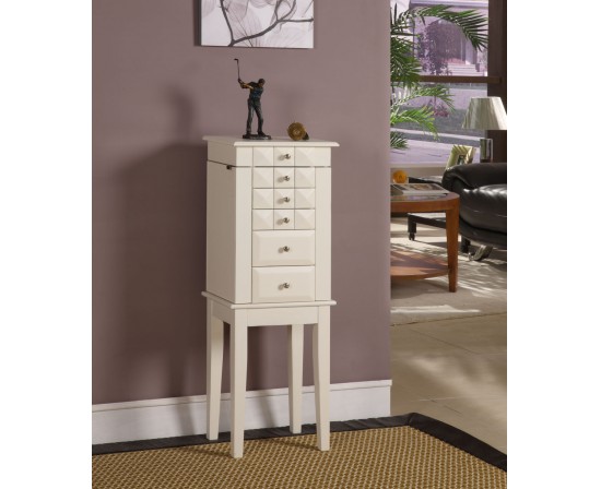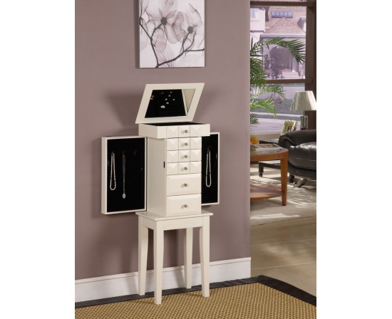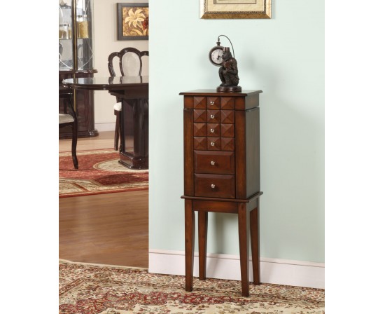 This wonderful, versatile, easy-to-match jewelry armoire illustrates character and fine workmanship. It features 5 drawers, 2 side-swing doors, a flip-top upper compartment with inset mirror, tapered legs, and a "coffee" finish.