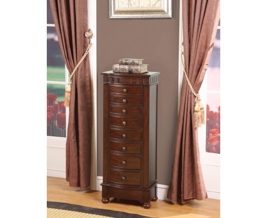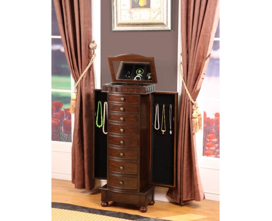 Add this beautiful armoire to accent any room while storing and protecting your most treasured items. Made with a five-step finish, available in the colors coffee and antique beige, this classy jewelry armoire has 8 spacious felt-lined drawers and 2 side doors with double rows of hooks for necklaces and longer chains The top flips open to reveal a vanity mirror and smaller compartments that are perfect for displaying rings, brooches, earrings and other little trinkets.