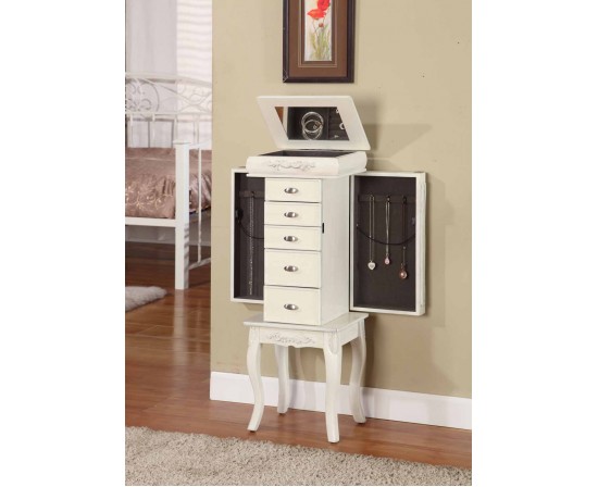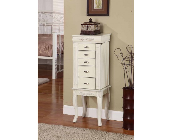 Handcrafted with a distressed white finish, this antique looking jewelry armoire features two elegant flower carvings on its face, cabriolet legs, carvings on the swing-out doors, Queen Ann inspired plated drawer pulls, and a lift top mirror that reveals a lined and divided compartments for different types of jewelry.