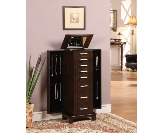 This modern and chic jewelry armoire has 7 spacious drawers in a mahogany finish with contrasting silver handles.