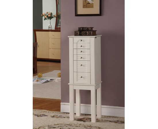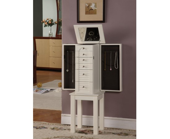 This jewelry armoire in white will make a great addition to any country or nautical theme room. It features two large drawers and three shallow drawers for easier organization of different items. The uppermost compartment is accessed by a mirrored lid, and the sides swing open for storage of necklaces or bracelets on multiple hooks. All interiors are lined with felt.